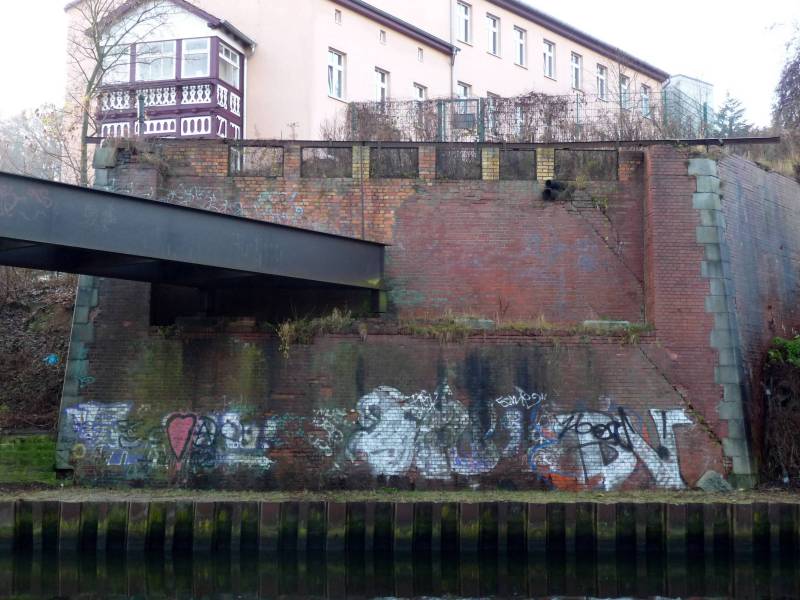 - Beschreibung: Die Überreste der Enver-Pascha-Brücke am Teltowkanal, im Hintergrund Wohnhäuser der Allee nach Glienicke