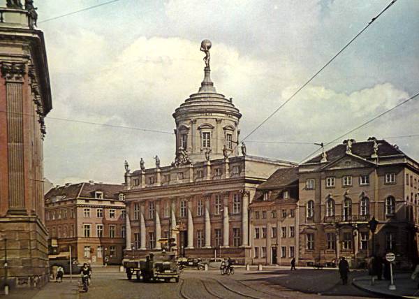 - Beschreibung: Das Alte Rathaus aus der Humboldtstraße gesehen; ganz rechts das Stadtschloß, neben dem Rathaus das Windelbandsche Haus und das Knobelsdorffhaus