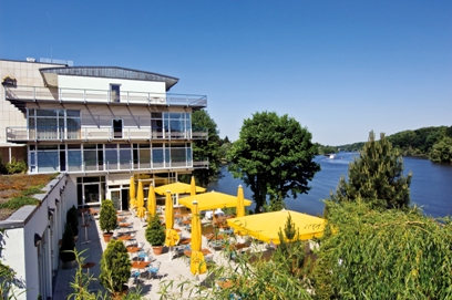 - Beschreibung: Foto der Terrasse des avendi Hotel mit Blick über den Griebnitzsee