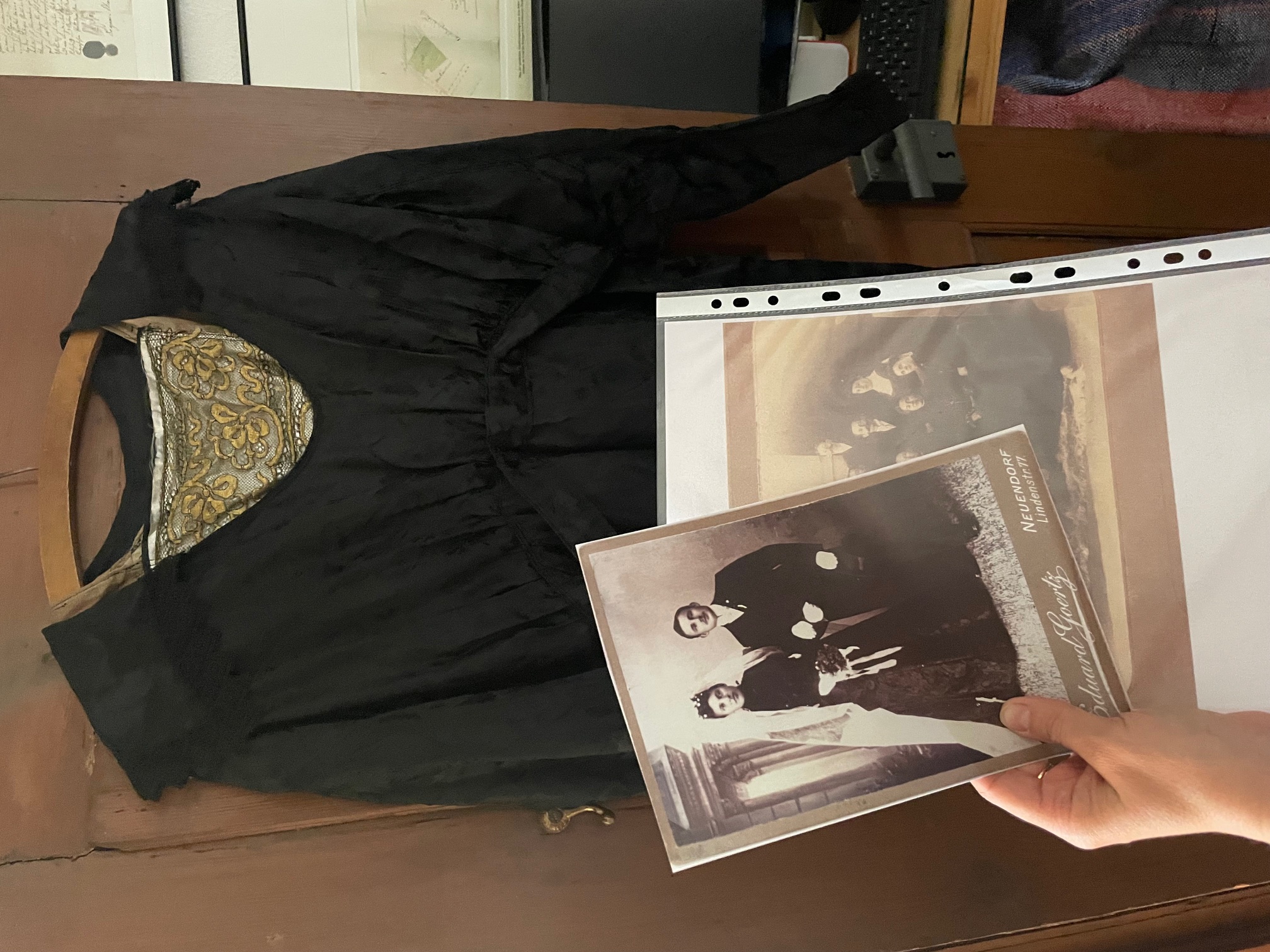 Original Nowaweser Brautkleid, getragen von Pauline Hilscher, geb. Lüscher, anlässlich ihrer Hochzeit mit Willi Hilscher am 21. Juli 1906 in Nowawes. Getraut in der Friedrichskirche durch Pfarrer Koller.