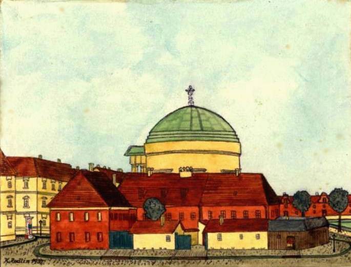 - Beschreibung: Gemälde der ehemaligen Feuerwache Potsdam im Jahr 1862; im Hintergrund die Kuppel der Französischen Kirche