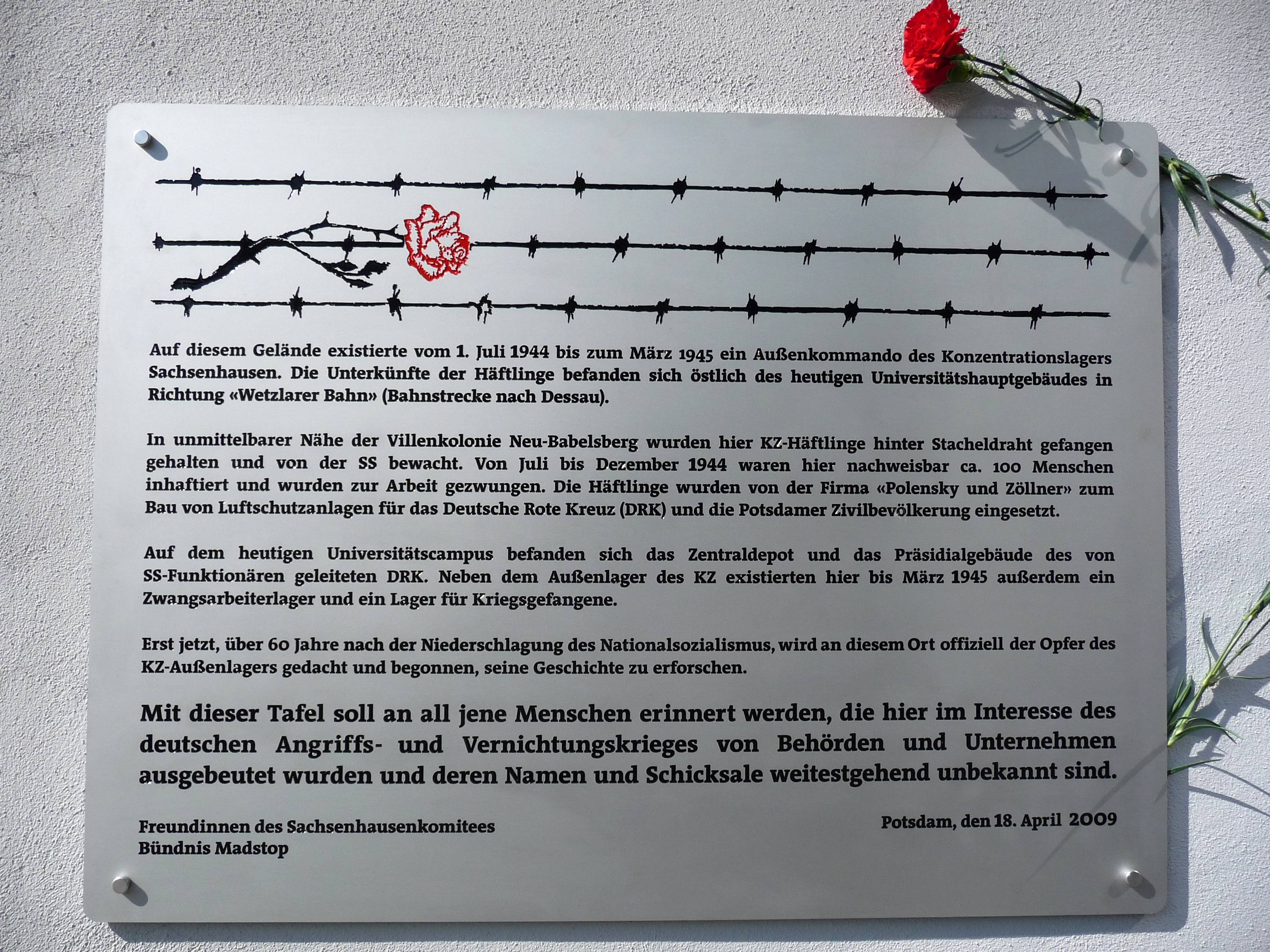 - Beschreibung: Foto von der Gedenktafel über NS-Lager beim ehemaligen Präsidialgebäude vom Deutschen Roten Kreuz auf dem Gelände der Universität Potsdam