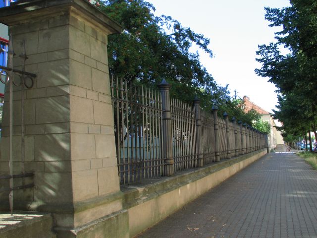 - Beschreibung: Foto vom historischen Zaun der ehemaligen Leibgarde-Husaren-Kaserne (Berliner Straße) - jetzt an der Voltaire-Schule Potsdam, in der Lindenstraße 32–33, gegenüber dem Großen Militär-Waisenhaus