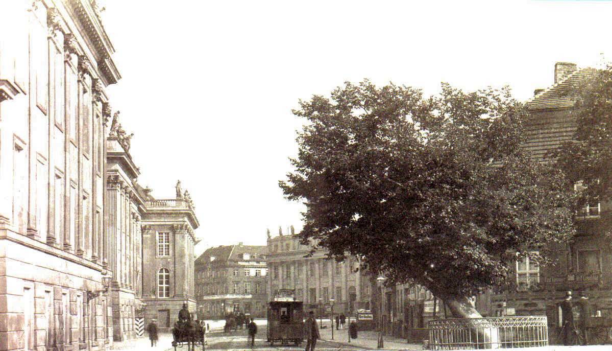 - Beschreibung: Die Bittschriftenlinde in der Humboldtstraße, links das Stadtschloß