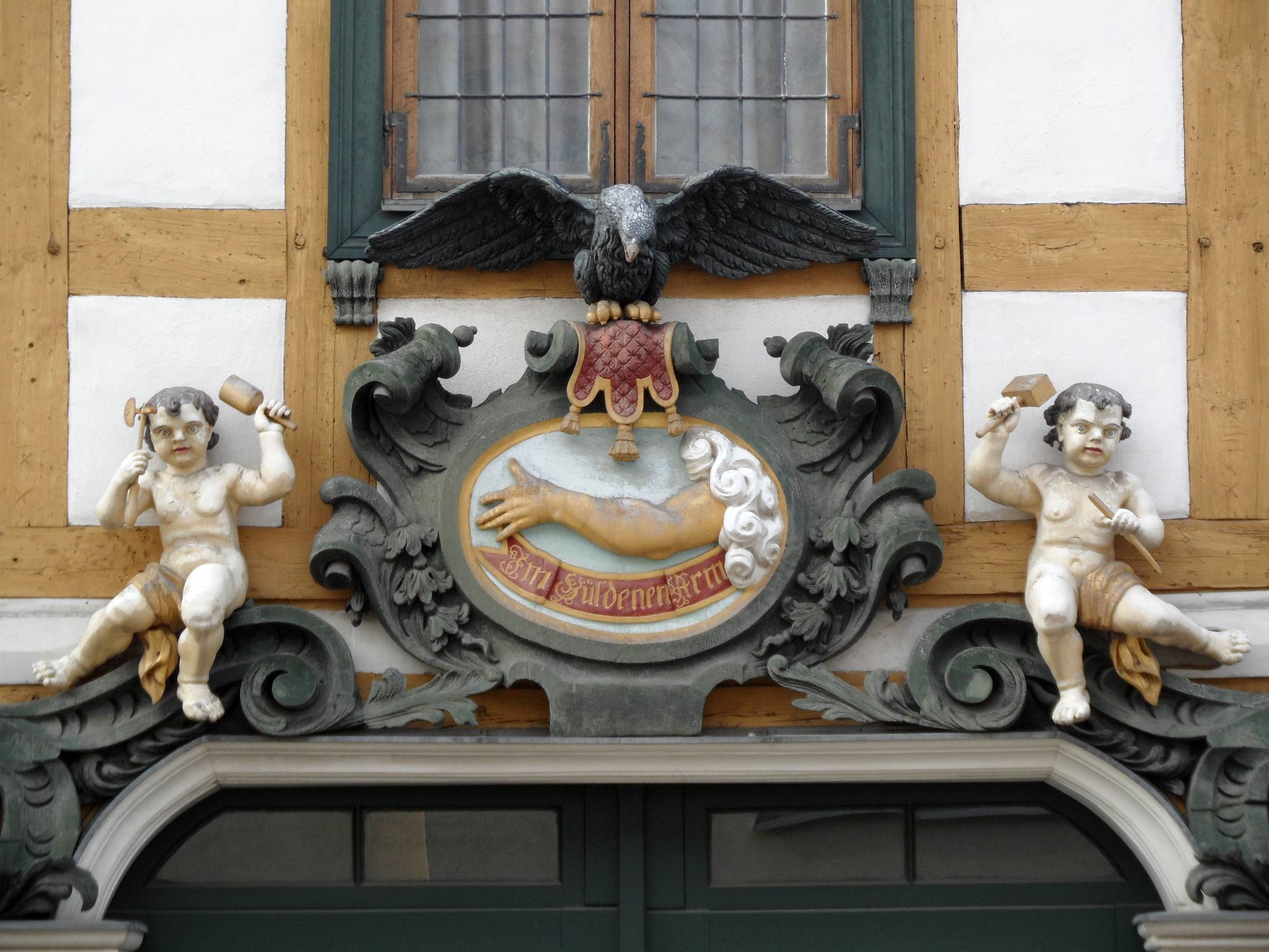 - Beschreibung: Schild des Hauses Im Güldenen Arm in der Hermann-Elflein-Straße