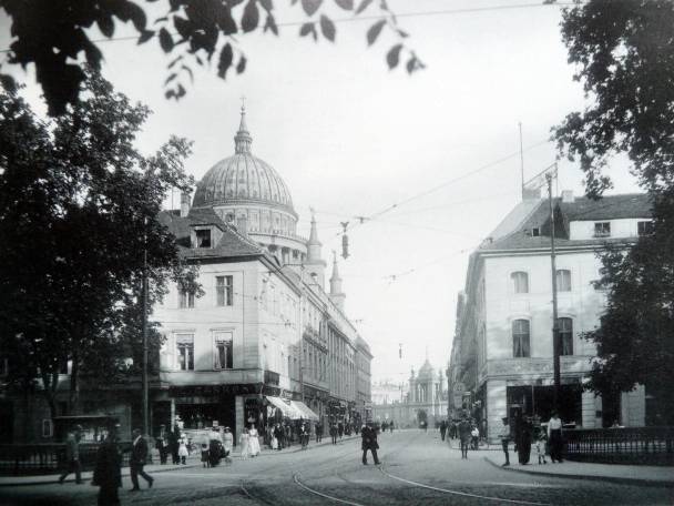 - Beschreibung: Foto der Kaiserstraße mit Blick auf das Stadtschloß; im Vordergrund die Kaiserbrücke und oben links die Kuppel der Nikolaikirche