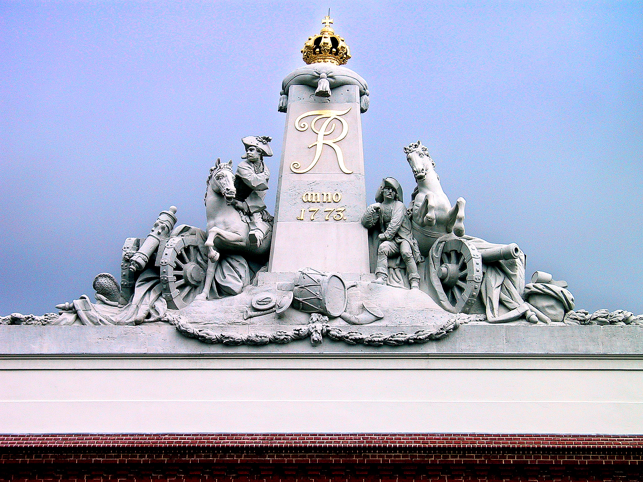 - Beschreibung: Foto der Boumann-Skulptur auf dem Kammergebäude der Roten Kaserne