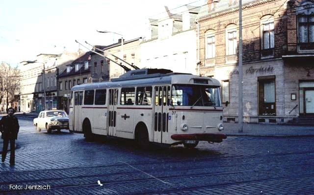 - Beschreibung: Foto eines O-Buses in der Karl-Liebknecht-Straße, Kreuzung Rudolf-Breitscheid-Straße; bei dem O-Bus handelt es sich um die Baureihe „9Tr“ des Herstellers „Škoda“ (Baujahr: 1968; Wagennummer 36)