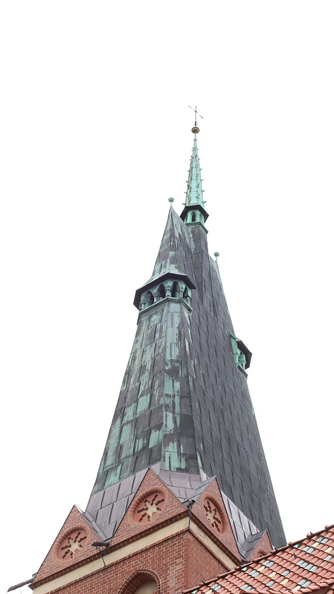 Kirche Bornim Turm mit Wimpergen und Gauben. 2023.