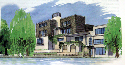 - Beschreibung: Aquarell-Gemälde der Villa Louis Hagen (möglicher Titel: „Moderne am Ufer des Jungfernsees“)