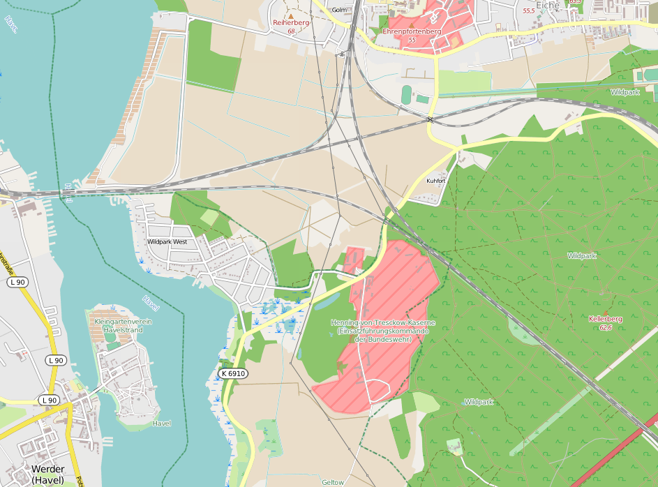 - Beschreibung: Lage des Ortsteils Wildpark West am Ufer der Havel, gegenüber von Werder (Havel)