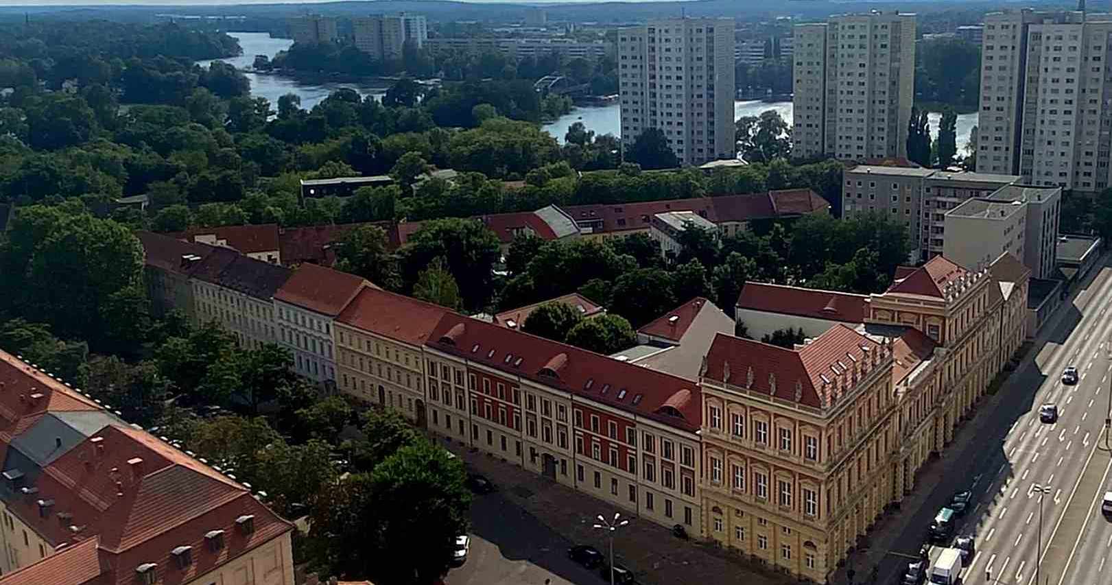 - Beschreibung: Blick auf das Wohngebiet Kiez vom Turm der Garnisonkirche, 2023