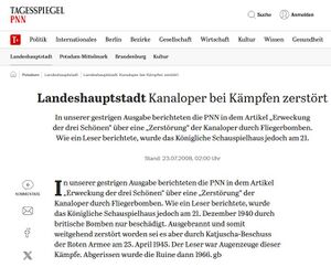 Im Beitrag Mickisch/Schnitzler über das Schauspielhaus in den Mitteilungen der Studiengemeinschaft Sanssouci (MSGS 12 (2007), H. 1, S. 2 - 41 und Mickisch, S. 42-51), ist dergleichen nicht zu finden. Das Gebäude ist erst am 25. 4. 1945 durch Beschuss der Roten Armee in Flammen aufgegangen (S. 47)".
