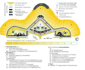Ob die gegenüber der ersten von Diener ausgearbeiteten Planung erweiterten Bauelemente des Festungsmodells schon in dieser Phase oder erst später zugefügt wurden, kann nicht entschieden werden. Auf jeden Fall sind bei komplexen geophysikalischen Sondierungen durch das Institut für Erd- und Umweltwissenschaften der Uni Potsdam im Jahre 2010 zusätzliche, jetzt verdeckte Baukörper erkannt worden (Abb. Gliederung des Festungsmodells). Besonders durch die geomagnetische Vermessung konnte ein Vorgraben entdeckt werden, der durch Drahtverhaue ein deutliches Annäherungshindernis darstellt. Als militärisches Projekt war 1893 schon während der Bauarbeiten Geheimhaltung angeordnet. Darum wurde die schon nach dem Attentat auf Wilhelm I. 1878 eingerichtete Absperrung wieder aktiviert und das Gelände ständig bewacht. Trotzdem drangen vage Andeutungen mit fehlerhaften Details in die Lokalpresse. Die undichte Stelle der Geheimhaltung war vermutlich der Kaiser selbst. Als ihm der Maurerpolier Karl Lucke aus Nowawes das fast fertige Festungsmodell vorzeigte und Wilhelm II. als Anerkennung für die von den Handwerkern geleistete Arbeit andeutete, dann müsse er wohl die ganze Mannschaft zum Festessen einladen, antworte Lucke spontan „Das is keene dumme Idee“. Das war dann in Hofkreisen eine geflügelte Redewendung und dabei sind dann offensichtlich auch einige Informationen über das Geheimobjekt nach außen gelangt.